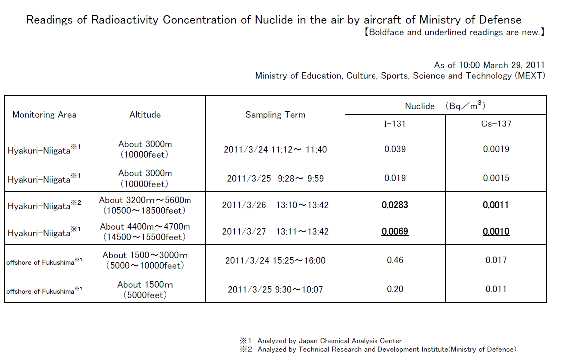 - Grazie a Luca B. abbiamo le immagini del documento in lingua inglese. La prima colonna contiene gli isotopi e tra parentesi la loro vita media. Attenzione che il numero può avere unità di misura diverse: lo iodio-131 si dimezza in 8 giorni, mentre quello 134 in 56 minuti circa. La seconda colonna contiene le misure effettuate in data 26 marzo (quelle dichiarate sbagliate!), la seconda e la terza la misura dello stesso campione rifatta e ricontrollata. La quarta contiene le misure effettuate su un altro campione prelevato il 27. Le ore nella prima riga dell'intestazione probabilmente sono l'ora del prelievo e quella di inizio acquisizione spettro gamma. La seconda riga è una misura della dose sulla superficie dell'acqua e viene dichiarata essere superiore al Sievert per ora. Si noti come questo valore non sia cambiato nel corso delle rianalisi. Quella sequenza di ideogrammi nelle celle senza numeri significa "inferiore al limite misurabile" (grazie mamoru). Le celle con i riquadri sono quelle che sono state corrette.