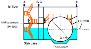 Le altezze sono espresse in millimetri e misurate rispetto al livello medio del mare (OP), quindi in entrambi i casi possiamo dire l'acqua è circa a 3.2 metri sul livello del mare, ma per sapere quanto sia profonda dobbiamo conoscere a che livello si trova il pavimento. In base allo schema fornito da TEPCO e mostrato nell'immagine qui a lato si può vedere come il centro della sezione circolare del toro si trovi a OP1900 e visto che il diametro è di 8.9 metri, allora il fondo del toro si trova a OP-2250. Da qui possiamo ragionevolmente dire che la profondità dell'acqua è di circa 5 metri e mezzo.